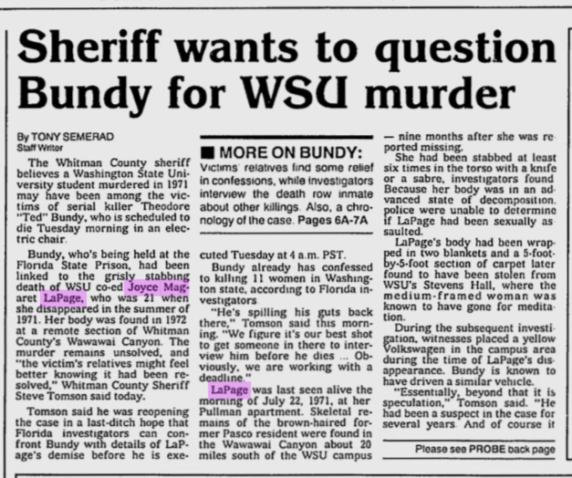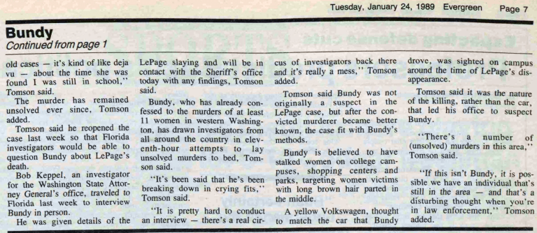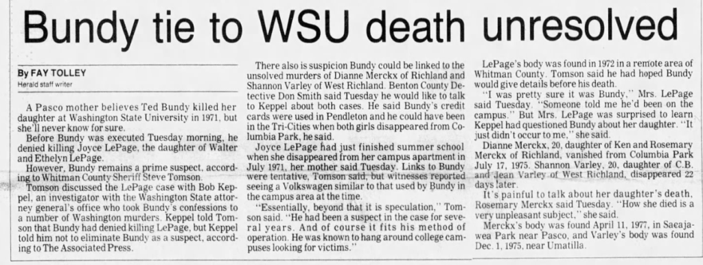 In 1989, former Whitman County Sheriff Steve Thomson said ‘there were certain similarities between this case and others that brought us to Bundy, and we later placed him in this area at about that time.’ Sergeant Maupin points out that: ‘profile-wise, she did fit the description (of Bundy’s victims). She had auburn hair. She was beautiful. She was tall, athletic and college-age.’ … ‘I don’t want to rule anybody completely out, but, my personal opinion is no. It wasn’t Ted Bundy. My gut feeling is this was someone she knew.’ Current Whitman County Sheriff Brett Myers said that ‘there were certain things that kind of leaned toward Ted Bundy, and there were things that leaned away. There were reports of a person matching Bundy’s description being in the area.’ Myers followed every reported lead and spent nearly his entire 26-year career trying to solve LePage’s murder, even going so far as to try to interview Ted while on death row. Regarding Bundy as a suspect in his sister’s murder, Bruce said: ‘we have to broaden it (the case) out and take all the possibilities. Ted Bundy is one of them. But sometimes you get too broad and get distracted and the probability goes out.’