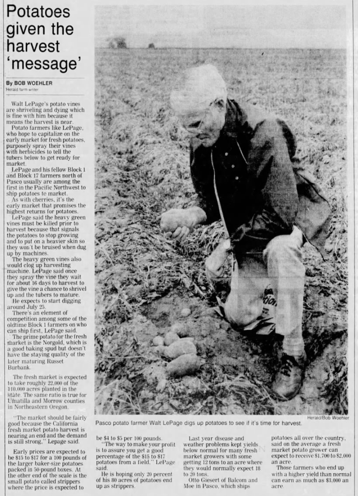 In 1943 while working at Hanford Engineer Works as an instrument technician Walter met his future wife, who was a student and employed in their chemistry department; the couple were wed on October 5th, 1945. Before WWII, Mr. LePage learned how to fly airplanes and for most of the war training pilots near Cuero, TX; when the flight school closed in 1948 the couple purchased some undeveloped farmland just north of Pasco, WA and began the W.A. LePage Seed Company, which was family owned and operated for 46 years. Additionally, Mr. LePage helped found the Washington State Potato Commission.