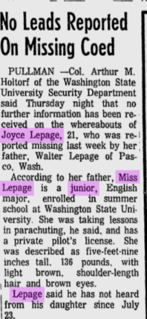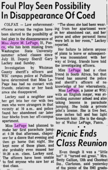 Joyce disappeared under mysterious circumstances on Thursday, July 22, 1971; she had been wearing cutoff jeans and a blue blouse late in the day when friends dropped her off at her apartment around 10 PM. Most likely because she lived away from home and took place before cell phones existed, it took ten days for Mr. LePage to report his daughter missing after she didn’t come home for a planned weekend visit. During their investigation, investigators found her car parked about 3-4 blocks away from her apartment on Oak Street; in it were her shoes and purse (sans her ID and keys). LePage had been taking skydiving lessons and her first parachute jump was scheduled for the following day (which she never showed up for). Regarding his sister as missing, Bruce said that ‘she had no reason to take off, and was planning to come down for the Water Follies (boat races) that coming weekend. She just never showed up.’ Joyce left behind all of her personal belongings and told none of her loved ones that she had any plans of taking off, and because of this, detectives immediately felt that some form of foul play was involved.