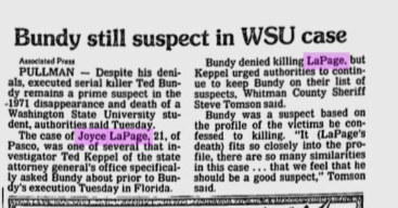 Ted also hinted to former King County Detective Dr. Robert Keppel that he committed a murder in Seattle in 1972 and another the following year that involved a hitchhiker near Tumwater, but he refused to elaborate on either. By his own admission, he had by then mastered the necessary skills (keep in mind, this was in the days before DNA became a thing) to leave minimal incriminating forensic evidence behind at crime scenes. Before Bundy was executed in Florida, the Whitman County Sheriff’s Department gave Dr. Keppel information related to the LePage case, and the following is an exchange between the two men in January 1989:
