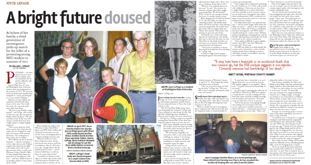 As of January 2023, Joyce LePage’s murder is the oldest unsolved case in Whitman County, and because it is still considered an ‘ongoing, open investigation’ the sheriff’s office will not release her case file to the public. To this day, Bruce LePage still holds onto hope that his sisters murder will be solved, and is offering a $100,000 reward to anyone with information that helps lead to the arrest and conviction of the person responsible ($60,000 for an arrest and an additional $40,000 for a conviction): ‘in a way it sounds foolish to do a reward at this time. If there was going to be one it might have helped if it was done earlier on. But I guess I don’t care.’ … ‘I will remain involved and keep the reward up for $100,000 for as long as I am alive.’