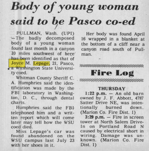 Roughly nine months after her mysterious disappearance, on April 16, 1972, a teenager scouring the area for gemstones with his mom (some reports say they were looking for opals, another says garnets) discovered the skeletal remains of LePage along a dry creek bed in a gully roughly 10-15 miles south of Pullman, just off Wawawai Road in Wawawai Canyon. Her remains were well hidden by dense brush at the bottom of a deep ravine that was only accessible by a narrow gravel road, and she was enveloped in her school’s missing carpet as well as two military-style blankets then bound with rope (she was wrapped in the blankets first and then the carpet). Sheriff Myers said: ‘it starts as a missing person’s case. It starts out also as a missing piece of carpet from a WSU building.’ … ‘We have a theft case and a missing person case, but it was not until April of 1972 that we discovered that her body was deliberately put somewhere in the carpet.’ A positive identification was made thanks to Joyce’s dental records as well as genetic testing that was conducted by the FBI. Former Whitman County Sheriff Mike Humhprey said: ‘there definitely was foul play, but the official and specific cause of death has not been determined.’