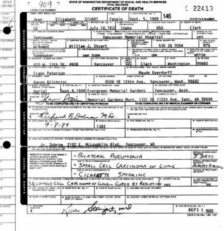 Jean Gilchrist-Stuart died at the age of fifty-eight on September 5, 1982 in Vancouver, WA; her obituary said that she was a homemaker.William Gilchrist died at the age of sixty-eight in a Vancouver care center on February 27, 1999. According to his obituary, he was a longshoreman for thirty-five years before his death and he was a member of the Longshoremen’s union. He also enjoyed watching TV and playing cribbage. Diane’s brother Donald William Gilchrist passed away on July 1, 2021.