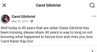 Five of the Gilchrist children (Diane is in the top far left).Diane Sue Gilchrist.A picture (from 2013) of what Diane Gilchrist could look like using age-progression to age 54.A missing-persons flier for Diane Gilchrist.One of Carol Gilchrist’s Facebook posts about her sister.Another one of Carol Gilchrist’s Facebook posts about her sister.Part one of an article about Warren Leslie Forrest that mentions Diane Gilchrist published in The Oregonian on January 31, 2023.Part two of an article about Warren Leslie Forrest that mentions Diane Gilchrist published in The Oregonian on January 31, 2023.A comment made on a Reddit post about Diane.The house that Diane was living at the time of her disappearance, located at 1811 Franklin Street in Vancouver, WA.William Gilchrist’s draft card from Korea.A picture of Georgeanne Jordan taken from the 1949 Vancouver High School yearbook. She was born on January 17, 1932 and died at the age if eighty-one on February 7, 2013.Some information related to William Gilchrist’s criminal record.William Gilchrist and his first wife’s marriage affidavit and application to wed dated December 20, 1949.William Gilchrist and his first wife’s marriage statistics dated December 20, 1949.William Gilchrist and his first wife’s certificate of marriage dated January 9, 1949.William Gilchrist and Jean Peterson’s application for a marriage license dated April 16, 1954.William Gilchrist and Jean Peterson’s certificate of marriage dated April 16, 1954.William and Jean are listed in those seeking a divorce published in The Columbian on March 12, 1968.A picture of Diane’s brother William Gilchrist, taken from The Spokane Chronicle on May 24, 1971.William and Jeans names in a list of people that applied for a marriage license published in The Columbian on November 3, 1977.William and Jean are listed in those seeking a divorce published in The Columbian on September 30, 1979.William and Jean’s certificate of divorce dated June 8, 1977.William Gilchrist and Jean Peterson’s certificate of marriage dated November 16, 1977.A newspaper clipping that mentions Diane’s brother Donald published in The Columbian on November 23, 1979. William and Jean Gilchrist’s certificate of the invalidity of marriage dated December 15, 1980. Jean E. Gilchrist and William J. Stuart applied for a marriage license published on The Columbian on September 15, 1982.Jean Gilchrist and William Stuart’s certificate of marriage dated September 16, 1982.Jeans name in a list of funeral services that was published in The Columbian on September 7, 1989.Obituary for Jean E. Stuart published in The Columbian on September 7, 1989.Obituary for Jean E. Stuart published in The Columbian on September 7, 1989.Jean Stuart’s death certificate.William Gilchrist’s service date and time listed in The Columbian on March 1, 1999.William Gilchrist’s obituary published in The Columbian on March 1, 1999.William Gilchrist’s grave site.Donald Gilchrist.