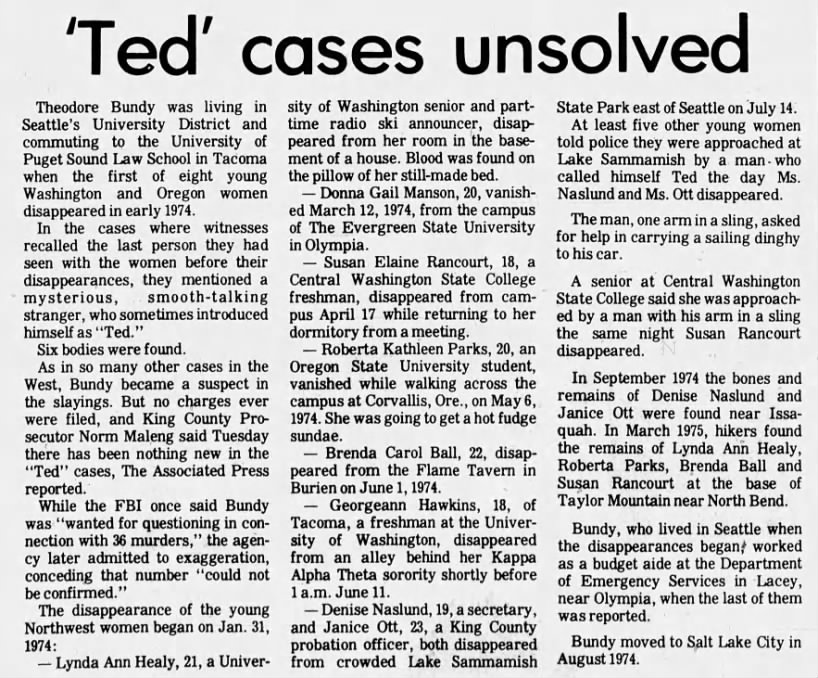 Joyce Healy giving baby Lynda a bath. Picture courtesy of the Healy family archives.Joyce holding baby Lynda. Picture courtesy of the Healy family archives.Another shot of Joyce holding Lynda. Picture courtesy of the Healy family archives.A picture of Joyce holding Lynda and her baby brother Robert. Picture courtesy of the Healy family archives.Another shot of Joyce holding Lynda and baby Robert. Picture courtesy of the Healy family archives.Joyce, Lynda, and Robert playing outside. Picture courtesy of the Healy family archives.The three Healy children. Picture courtesy of the Healy family archives.Lynda holding a rather large cat. Picture courtesy of the Healy family archives.Lynda dressed in her ballet outfit. Picture courtesy of the Healy family archives.A screenshot of Lynda Healy from the Amazon special, ‘Falling for a Killer.’A screenshot of Lynda and Robert Healy from the Amazon special, ‘Falling for a Killer.’A screenshot of Lynda Healy and her brother Robert around Christmastime from the Amazon special, ‘Falling for a Killer.’Another screenshot of Lynda Healy and her brother Robert around Christmastime from the Amazon special, ‘Falling for a Killer.’Lynda Ann Healy from her days at Newport High School. Lynda Healy. She always reminded me a bit of Lacey Peterson in this picture.Lynda Healy and her mother, Joyce.A casual Lynda.Another b&w of Lynda.Nice catch.Beautiful Lynda.Lynda, on the right. The Healy’s.A picture of Joyce, Laura, and Robert Healy.Joyce and James Healy, the couple on the right.Joyce and Laura Ann Healy.Joyce and her three kids.Lynda and her camera, which her family said she never went anywhere without.Another picture of Lynda by the water.Lynda Ann Healy’s missing persons flier.Lynda Ann Healy’s death certificate.A sign for Linda’s POE: the Northwest Skier.What Dante’s Tavern looked like, before it burned down in 2015.The inside of Dante’s Tavern before it burned down.The ‘Bundy Booth’ at Dante’s Tavern in Seattle, WA.Firefighters putting out the electrical fire at Dante’s Tavern in 2015. Photo courtesy of OddStops.What Dante’s looks like today, located at 5300 Roosevelt Way in Seattle; in 2015 the building was destroyed by an electrical fire. Picture taken in May 2025.A statement from Dr. Bob Keppel in regards to Bundy’s schedule and Lynda Ann Healy, who were both taking Psych 498 and 499 in the winter and spring quarter of 1972.Lynda Ann Healy’s school schedule from the semester she was killed.Part one of Lynda Healy’s University of Washington transcript.Part two of Lynda Healy’s University of Washington transcript.Lynda Ann Healy’s one-time residence. Picture courtesy of the King County Sheriff’s Department.The home at 5517 12th Street NE in Seattle, where Lynda resided with her roommates. Picture courtesy of the King County Sheriff’s Department.The front yard of Lynda Healy’s one-time residence. Picture courtesy of the King County Sheriff’s Department.The side yard of Lynda Healy’s one-time house. Picture courtesy of the King County Sheriff’s Department.The side door to Lynda Healy’s one-time residence. Picture courtesy of the King County Sheriff’s Department.The side of Lynda Healy’s one-time house. Picture courtesy of the King County Sheriff’s Department.The side door showing the stairwell leading to Lynda Healy’s basement bedroom. Picture courtesy of the King County Sheriff’s Department.The door and stairs that lead to Lynda Healy’s bedroom. Picture courtesy of the King County Sheriff’s Department.The stairs leading to Healy’s basement bedroom. Picture courtesy of the King County Sheriff’s Department.A vacuum at the bottom of the stairs at Healy’s shared residence. Picture courtesy of the King County Sheriff’s Department.The stairs leading down to Lynda Healy’s basement bedroom. Picture courtesy of the King County Sheriff’s Department.Another picture of Healy’s bedroom. Picture courtesy of the King County Sheriff’s Department.Lynda Healy’s basement bedroom. Picture courtesy of the King County Sheriff’s Department.Some blood on Lynda Healy’s mattress. Picture courtesy of the King County Sheriff’s Department.Crime scene photo of the inside of Lynda’s bedroom, note blood on the mattress. Picture courtesy of the King County Sheriff’s Department.Lynda’s bloody bedding. Picture courtesy of the King County Sheriff’s Department.Picture of the blood found on Lynda’s bedding. Picture courtesy of the King County Sheriff’s Department.Lynda Healy’s house, located at 5517 12th Ave NE in Seattle. Picture taken in May 2025.The porch at Lynda Healy’s one-time residence. Picture taken in May 2025.The side yard of Lynda Healy’s one-time residence. Picture taken in May 2025.The side of Lynda Healy’s one-time residence. Picture taken in May 2025.The roadway located in the back of Healy’s former residence. Picture taken in May 2025.The narrow roadway located in the back of Lynda Healy’s former residence, picture taken in May 2025.The back of Lynda Healy’s former residence, picture taken in May 2025.The trail on the side of Lynda Healy’s former residence, picture taken in May 2025.A VW bus that was sitting outside of Healy’s residence in May 2025.An article about the disappearance of Georgann Hawkins that mentions Lynda Healy published in The Daily Herald on June 13, 1974.An article about the disappearance of Georgann Hawkins that mentions Lynda Healy published in The Spokane Chronicle on June 13, 1974.An article about the disappearance of Georgann Hawkins that mentions Lynda Healy published in The Tri-City Herald on June 13, 1974.An article about the missing Seattle women that mentions Lynda Healy published in The Columbian on June 19, 1974.An article about the missing Seattle women that mentions Lynda Healy published in The Kitsap Sun on July 2, 1974.An article about the missing Seattle women that mentions Lynda Healy published in The Daily News on
