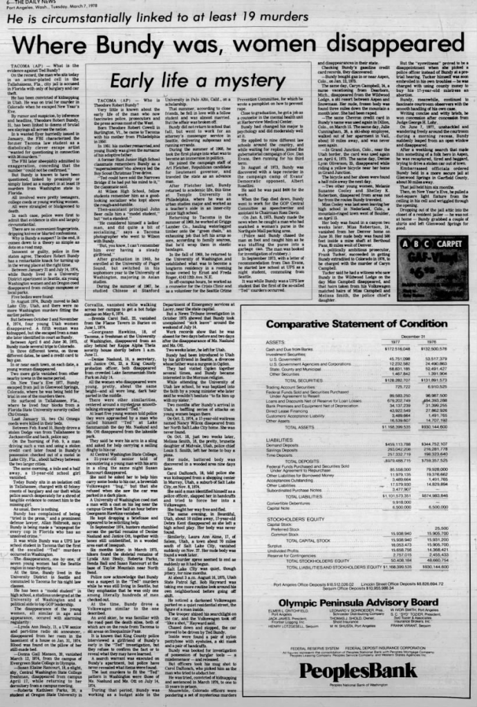 In January 1974 Bundy had been living in a second story room at the Rogers Boarding house located on 12th Avenue NE, which was only three blocks away from where Lynda Healy lived. At the time of her disappearance, Ted had been attending night law school at the University of Puget Sound, and according to his schedule he had class late on Monday’s, Wednesday’s, and Friday’s, however on Tuesday’s and Thursday’s things wrapped up for him early. Lynda went missing after midnight on a Thursday night, so Bundy wouldn’t have been tied up with school. Also, according to his long-term girlfriend Elizabeth Kloepfer, he often went to the bar that Healy went to with her friends the evening she was last seen alive. Additionally, Ted was in between jobs at the time: his previous position as the Assistant to the Washington State Republican Chairman ended in September 1973, and he remained unemployed until May 3, 1974 when he got a job at the Department of Emergency Services in Olympia (he was there until August 28, 1974).