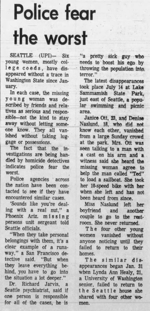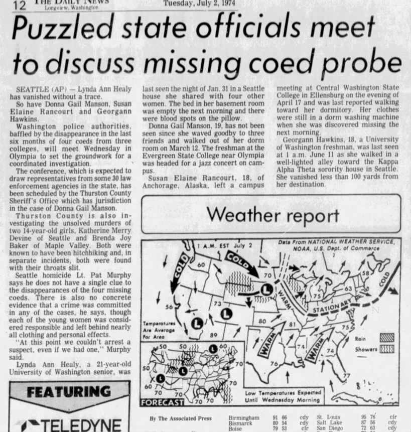 In the days that immediately followed, Healy’s disappearance barely made the news: the very first story about her was buried on the 35th page of the February 4, 1974 edition of The Seattle Times. Almost immediately after their daughter disappeared Jim and Joyce Healy hired a private investigator to look into the case, and the family initially wondered if maybe she ran off to live with family in Oregon. After some time, the PI came back to the Healy’s and told them that all the leads he received hit ‘dead ends.’ A reward was offered for information leading to her safe return, and it didn’t take long for Seattle investigators to strongly suspect foul play.