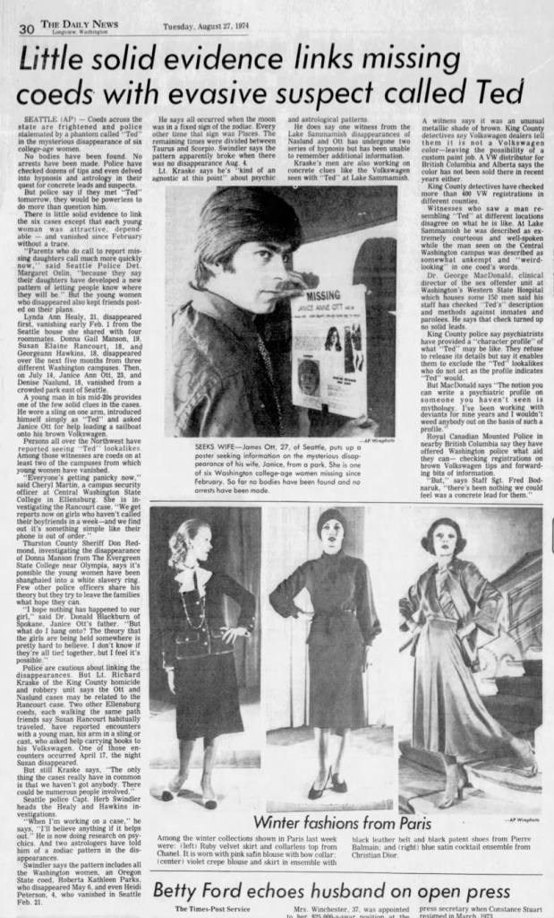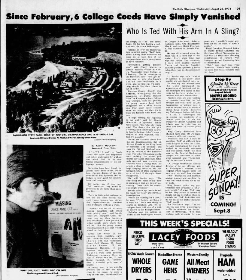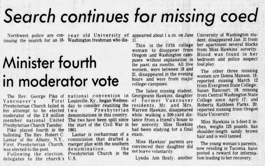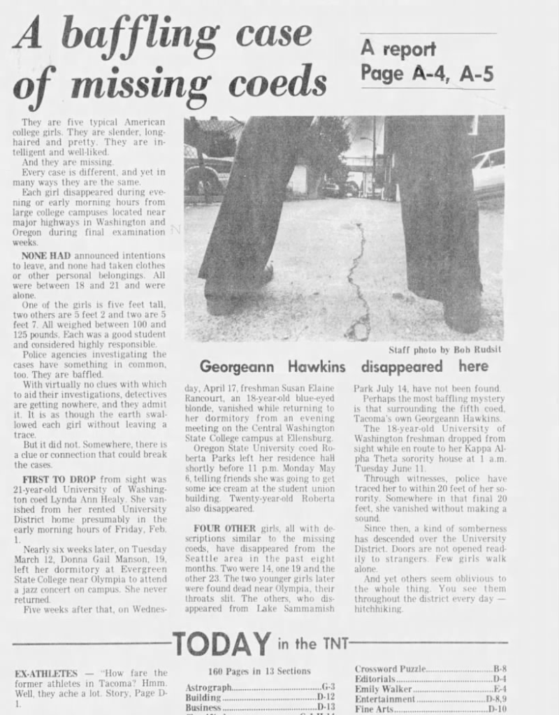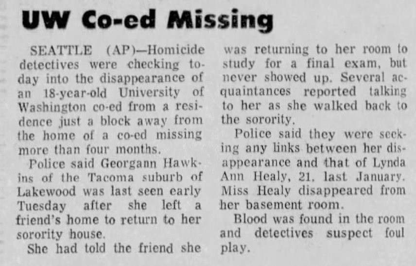 Less than two weeks later on June 11, 1974 eighteen-year-old Georgann Hawkins disappeared from an alleyway outside of her Kappa Alpha Theta Sorority house on the University of Washington campus. She had left a party early (and by herself) but before returning home had stopped by her boyfriend’s frat house to pick up some Spanish notes for her final that was the next day. In the days that followed, Warren and Edith waited by the phone waiting for word that their daughter was safe, which never came, and according to her father: ‘it doesn’t look very good.’