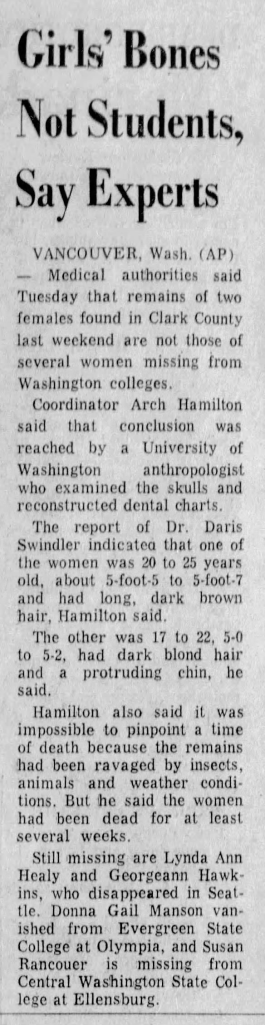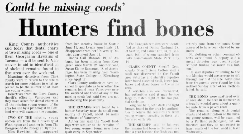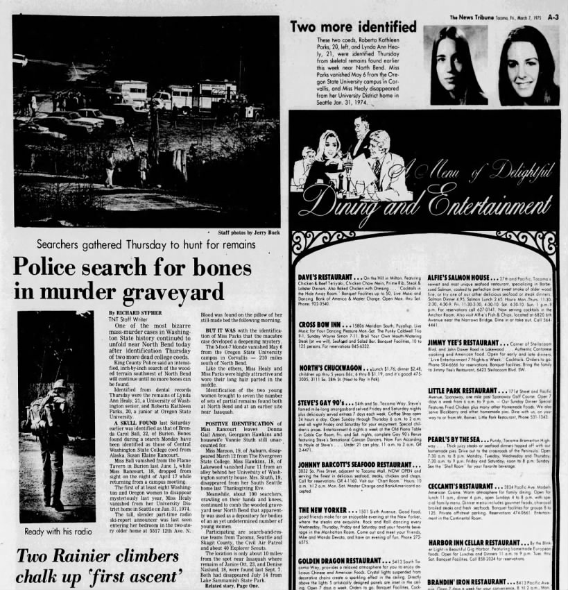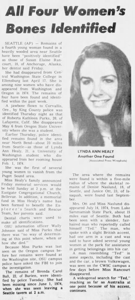Well over a year after Healy was last seen alive, on March 1, 1975 two Green River College students found human remains in a thick wooded area on Taylor Mountain, located just outside of Seattle. A skull uncovered by detectives would later be identified as belonging to Brenda Ball, which is a tad ironic because police initially were hesitant on linking her to the other missing women because she was a bit older than them, was not (technically) a college student, and was abducted from a bar and not an academic type setting. A further search of the area uncovered more bones, and just two days later on March 3, 1975 they came across Lynda Healy’s lower mandible as well as parts of Susan Rancourt and Roberta Parks.