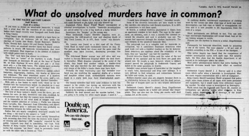 (Now deceased) Seattle Police Captain Herb Swindler was assigned to work the Healy investigation and eventually the other missing Seattle women. In July 1974 he publicly stated that there was no evidence that pinpointed any of the disappearances with the others, however he did admit that there were some similarities: ‘but, the real connection between the cases is not in the hard evidence, but in the lack of evidence. Usually in a series like this, bodies start to show up. There have been no bodies, none at all, and that is very unusual.’ About the disappearances, Captain Swindler said there were many theories about what may have happened to the young women, and that they ‘get people calling in to tell us ‘the flying saucers took them’ and ‘they’re being spirited away to white slavery’. Everybody’s got a theory, but no evidence.’