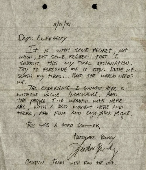 On August 30, 1974, Ted Bundy submitted his letter of resignation to the Department of Emergency Services in Olympia, WA.
