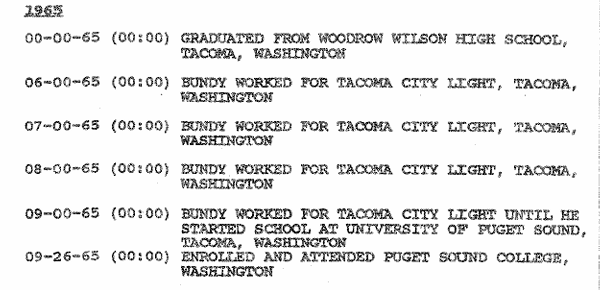 According to the ‘1992 TB FBI Multiagency Team Report,’ Bundy’s first job was at Tacoma City Light: he was there from June 1965 to September 1965 and was as a forklift operator.