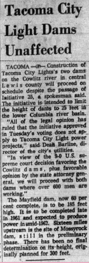 A newspaper article about the construction of two damns built by Tacoma City Light published in The Kitsap Sun on November 10, 1960.