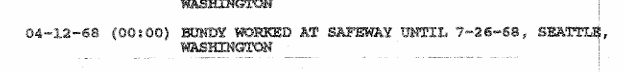 According to the ‘1992 TB FBI Multiagency Team Report,’ from April 12, 1968 to July 26, 1968 Ted worked at the Queen Anne Safeway in Seattle as a stock boy. According to Mrs. Ferris, ‘I helped him get a job at Safeway for a short while and he just quit, not even going back to work to tell them he was leaving.’