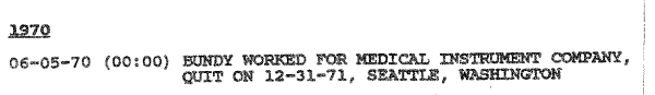 Although not mentioned in the ‘1992 FBI TB Multiagency Team Report,’ according to ‘tedbundy069063.wordpress.com’ from September 1969 to May 1970 Ted worked as an ‘Attorney Messenger and Process Servicer’ for a company called ‘Legal Messengers, Inc; in Seattle: he was a file clerk and courier but was fired for unjustified absences (he claimed that he was baby-sitting Liz’s daughter).