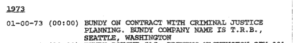According to the ‘1992 TB FBI Multiagency Team Report,’ in January 1973 Ted was ‘on contract’ with ‘criminal justice planning’ under the company name ‘T.R.B.’ located in Seattle, WA. February/April 30, 1973 – King County Program Planning.