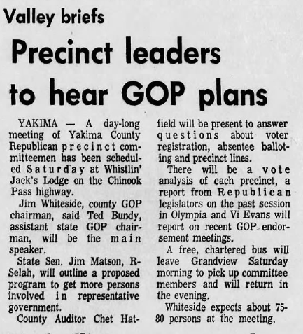 An article mentioning Bundy speaking in a daylong meeting of the Yakima County Republican precinct (before his August 1975 arrest) that was published by The Tri-City Herald on May 17, 1973.