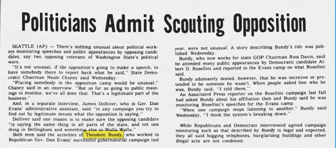 An article mentioning Bundy spying on Dan Evans Democratic opponent before his 1975 arrest published by The Olympian on August 29, 1973.