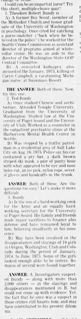 A three question ‘quiz’ about Ted Bundy that mention his time in the Seattle Crime Commission published in The News Tribune on August 7, 1977.