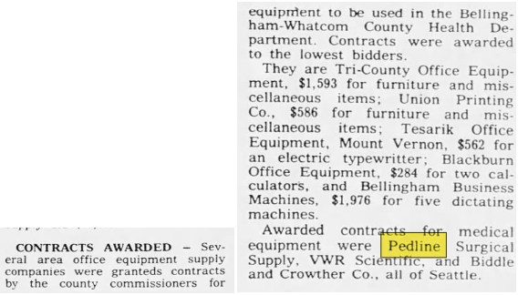 A newspaper article that mentions Bundy’s former POE, Pedline Surgical Supply published in The Bellingham Herald on July 18, 1976.