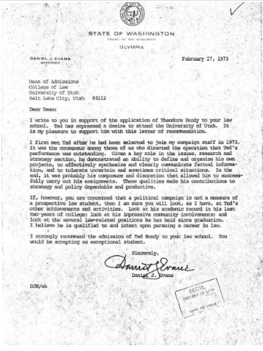 A letter of recommendation written by Dan Evans for Ted Bundy dated February 27, 1973.