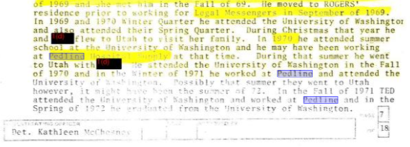 Bundy’s employment with Pedline is mentioned in the ‘Ted Bundy and File 1004 documents from Seattle PD’ document I found on ‘archive.org.’