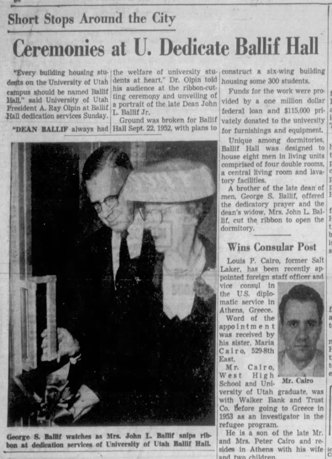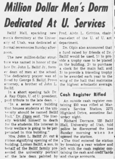 A newspaper article about the opening of Ballif Hall at the University of Utah that was published in The Deseret News on May 21, 1956. Sadly, the building was deemed ‘unusable’ in March 2003 due to severe maintenance issues and an extreme mold infestation; it was eventually demolished.