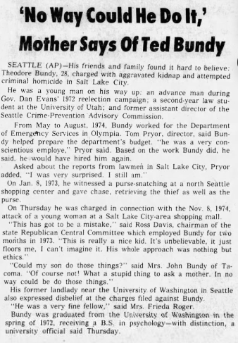 I just want to make a note: although I can’t find it listed in the ‘TB FBI Multiagency Team Report,’ the blogger ‘tedbundy069063.wordpress.com’ said that from ‘September/November 1968: Ted ‘worked in a Seattle shoe store.’ I don’t know how accurate this is, and all I could find while researching were memes about Al Bundy from ‘Married with Children’ (who coincidentally did work at a woman’s shoe store).