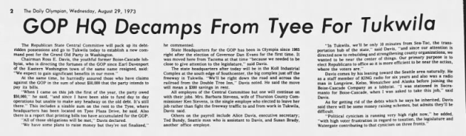 Bundy is mentioned in an article about being on the GOP payroll published in The Olympian on August 29, 1973.