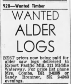 A want ad asking that anyone looking to sell alder logs to reach out to Export Pacific published in The News Tribune on June 6, 1969.