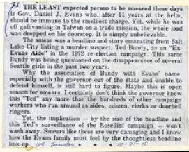 A newspaper article about Governor Evans that mentions Ted Bundy, courtesy of Tiffany Jean.
