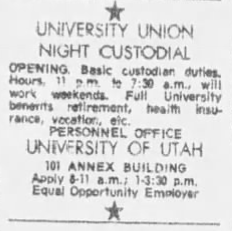 A newspaper clipping saying that The University of Utah is looking for a night custodian published in The Salt Lake Tribune on September 27, 1975.