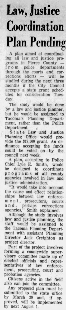 A newspaper article about Seattle’s Law & Justice Planning Office published in The News Tribune on January 8, 1973.