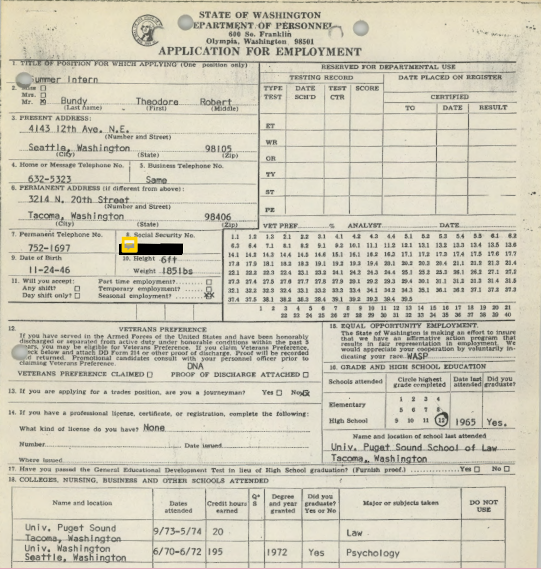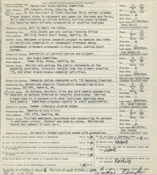 Page one of an employment application with the state of Washington dated signed on May 20, 1974 that Ted filled out that had his job history on it, courtesy of the King County Sheriff’s Department.