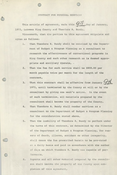 The first page of Ted’s contract for ‘personal services’ with King County’s Department of Budget and Program Planning, where he was brought on as a consultant.