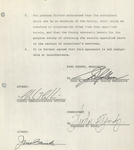 The second page of Ted’s contract for ‘personal services’ with King County’s Department of Budget and Program Planning, where he was brought on as a consultant.