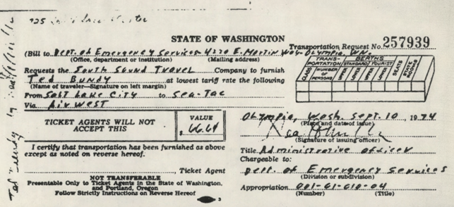 What looks like a request for ‘the lowest tariff rate’ for a flight Bundy took that was related to work, courtesy of the King County Sheriff’s Department; notice, his job title is ‘Administrative Officer.’