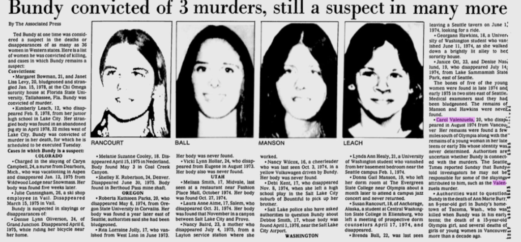Around the same time in 1973 multiple other girls went missing from the same general area in Oregon: Fifteen year old Alison Lynn Caufman was found strangled to death in June 1973. Rita Jolly disappeared from West Linn while out on a nightly walk on June 29, 1973 and Susan Wickersham was abducted while waiting for a ride home from friends in Bend, OR on July 11, 1973. Her body was found on January 20, 1976 with a gunshot wound in the head (it’s strongly speculated Bundy didn’t have anything to do with her death as it didn’t fit his MO). Vicki Lynn Hollar disappeared after leaving her new job as a seamstress at Bon Marche in Eugene on August 20, 1973 (her black 1965 VW Beetle has also never been recovered). In 1973 Laurie Lee Canady died from massive head injuries after being shoved out of a moving vehicle at a high rate of speed in Portland (I wasn’t able to find ANYTHING else about her).
