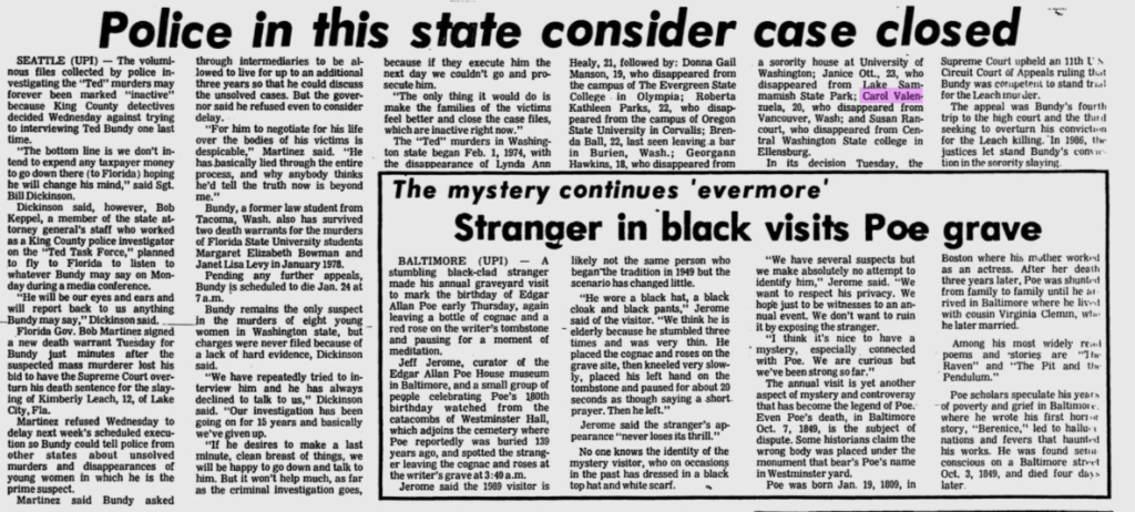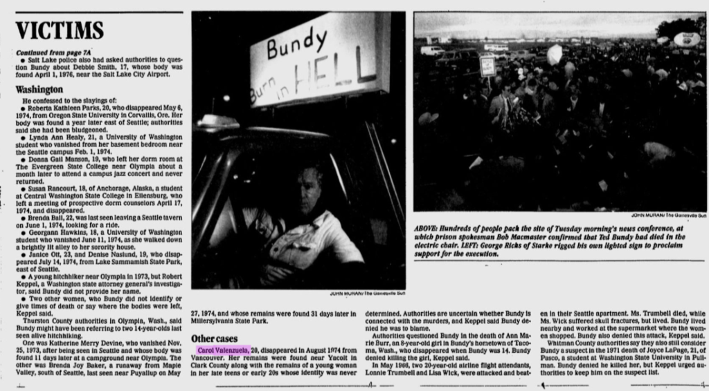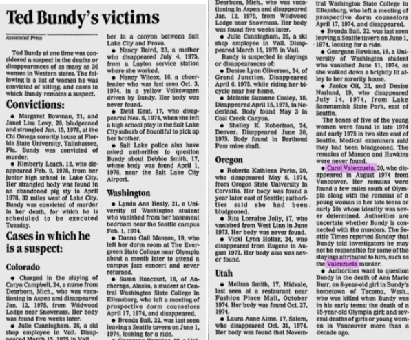 * In October 2024 one of Carol’s grandchildren reached out to me to not only point out some things that were incorrect in my piece but to also voice concern that her grandmothers article didn’t belong on a website about Ted Bundy. After a bit of back and forth I told her I would not remove the article but would add a disclaimer that Carol was not a victim of the serial murderer and more likely was killed by the hands of Warren Leslie Forrest. This blog may have Ted Bundy in the title but it’s turned into so much more than that. And I also want to add that I didn’t pay someone to go find me secret files about Ms. Valenzuela: everything I found was in the public domain and was literally at my fingertips. Where I do understand that it must be incredibly invasive to do a Google search and find an entire article written about your grandmother that was murdered in an incredibly brutal way, but everything I found was either in a newspaper article or from some sort of historical website, like Ancestry/MyHeritage. Also, if something is misspelled (like a name), that is information I pulled from another source, so if it’s not correct in my article it’s also incorrect in the original. I didn’t pull it out of thin air, it came from somewhere. Instead of Googling someone and having to go through 7-8 websites to get everything you need, I’m trying my hardest to be a complete resource. All of this information was easily found, and was free.