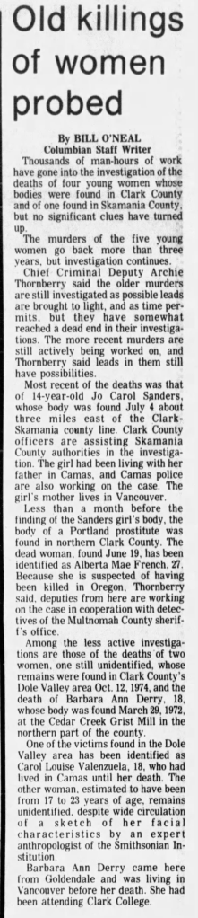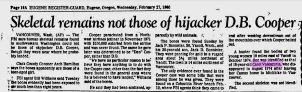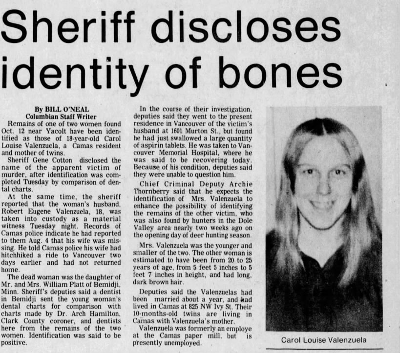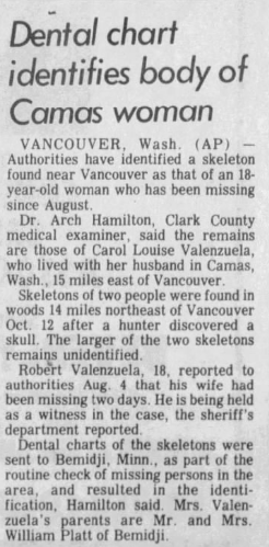 On the morning of October 12, 1974 a deer hunter stumbled upon a mass of hair in a heavily wooded area roughly fourteen miles northeast of Vancouver not far from the Oregon border. He thought it was an unusual place to find a wig and after investigating the mass with the shank of his gun quickly realized it was attached to a skull and that it wasn’t a wig at all. After law enforcement arrived they quickly realized there wasa second victim and their skeletal remains were scattered throughout the area. According to lab reports, the bones had not completely oxidized and it was determined that their deaths most likely did not occur suddenly, and possibly took place as a result of suffocation. Thebodies were discovered within a mile or so of where 16-year-old Jamie Grissim’s ID was found (she vanished on December 7, 1971 and to this day her remains have never been recovered). It was determined that the second woman’s death took place roughly six weeks before Valenzuela’s. Former Clark County Sheriff Gene Cotton reported that Robert Valenzuela was initially held as a ‘material witness’ although no charges were ever filed against him.