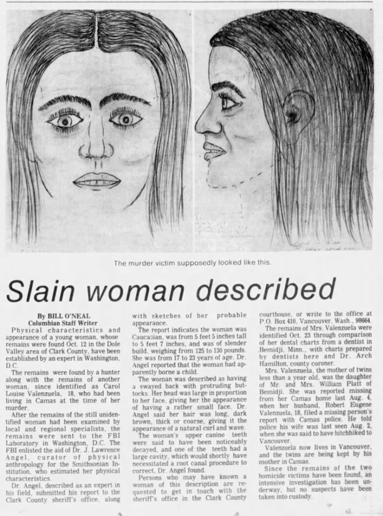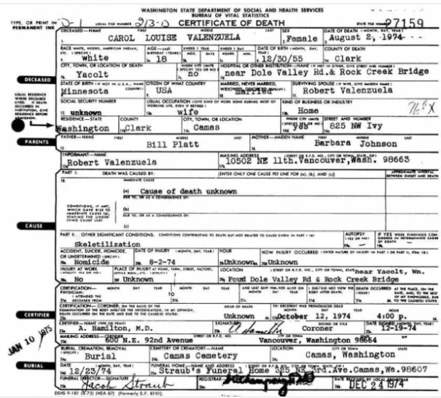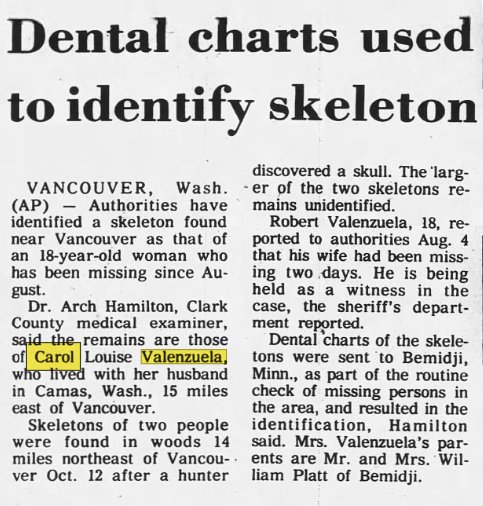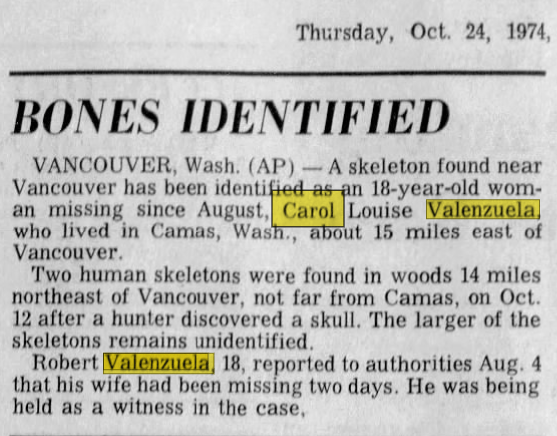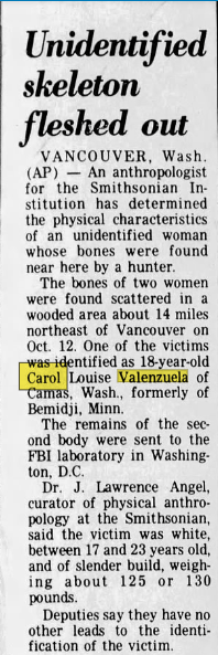 Seventeen-year-old Carol married Robert Valenzuela on August 17, 1973 and shortly after the couple became the parents of twins (they were ten months old when she was murdered). The couple were only married for about a year when on August 2, 1974 Carol disappeared after hitchhiking from Camas to Vancouver: she apparently made it to her intended destination and was last seen at a welfare office in Vancouver. At 11:00 AM a case worker told her to come back later that same afternoon at 1 PM to receive food stamps, however she never returned to the office and was never seen from again. Robert reported her missing two days later on August 4; she was eighteen years old. Ms. Valenzuela was not known to be involved in prostitution and had no criminal record. The case quickly went dry.