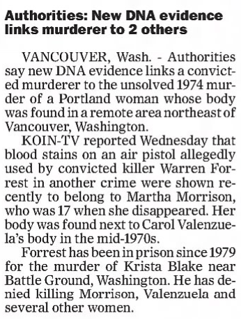 Warren Leslie Forrest was convicted of abducting and stabbing to death nineteen-year-old Krista Kay Blake in 1974 then burying her remains near Battle Ground on Tukes Mountain. He’s been in prison since October 2, 1974 and for decades Clark County law enforcement tried (with no success) to link him to other murders in the area. On October 12, 1974, the human remains of two women were found in Dole Valley near Vancouver, Washington. One was immediately identified as Carol Platt-Valenzuela but the other individual remained unidentified for over 40 years. But, thanks to DNA profiling and some blood left behind on the dart gun Forrest used to subdue his victims, in 2015 those remains were finally determined to be those of Martha Morrison, who disappeared from the Portland area under mysterious circumstances in September 1974. Two of his suspected victims have never been found: Diane Gilcrest (14) and Jamie Grissim (16). Before Warren was identified as the killer, Bundy was considered a person of interest in Morrison’s death (he’s still a suspect in Valenzuela’s murder). In 2020, Forrest was charged with the murder of Martha Morrison.