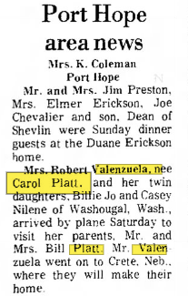 Sadly, Carols father Bill and her brother David died on January 2, 1986 in a car accident north of Bemidji; Bill was 58 and David was 28. Barbara Platt passed away on February 9, 1993 at the age of 61 in Fargo, ND. It does seem that Robert Valenzuela did eventually remarry. I’m respecting Carols family and will not disclose anything about her twins.