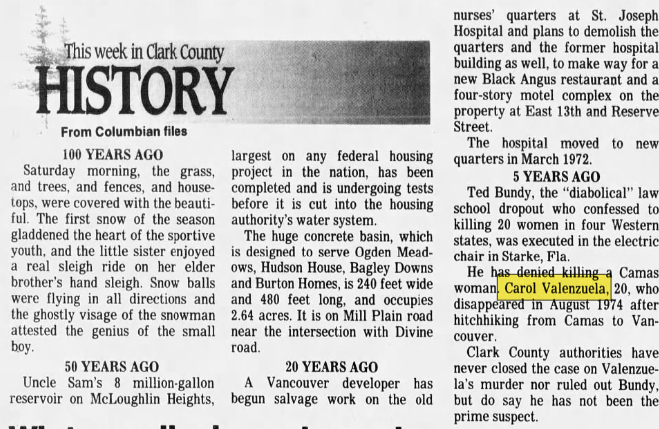 At the time Valenzuela disappeared in the summer of 1974 Bundy was still in a long term relationship with Liz Kloepfer and was residing in the Rogers Rooming House on 12th Avenue in Seattle. He was getting ready to move to Salt Lake City to begin his second attempt at law school and was employed with The Department of Emergency Services in Olympia (he worked there just for a few months from May 3, 1974 until August 28). Bundy told law enforcement that he wasn’t responsible for the death of Valenzuela, which is one of the only murders from the Pacific Northwest that he was suspected of that he denied. Most likely because Ted was a habitual liar he remained a suspect of Valenzuela’s murder for quite a few years, as he told investigators before he was executed he may or may not be responsible for additional murders other than the ones he was convicted of.