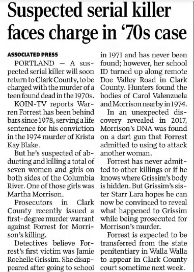 Warren Leslie Forrest has been in prison on a single murder count since 1974, when he was charged with the murder of nineteen year old Krista Kay Blake. In 2014, detectives began taking another look at physical evidence related to Forrest’s criminal history to help link him to any possible unsolved crimes, but it wasn’t until 2019 that DNA evidence helped link him to the murder of Morrison. Forensic experts from the Washington State Police Crime Lab isolated a partial DNA profile from bloodstains found on Forrest’s dart gun and cross-referenced it with Morrison’s DNA, which led to the positive identification of her remains. As a result, Forrest was identified as her killer. In January 2020 Forrest was extradited to Clark County to await charges in Martha Morrison’s murder. For the first time in 40 years he appeared in court on February 7, 2020, pleading not guilty. The trial was originally scheduled to begin on April 6 2020, but was delayed several times due to the COVID pandemic. The trial finally resumed in early 2023 and on February 1, 2023 a jury found him guilty of the murder of Martha Morrison. Sixteen days later, Forrest was given another life sentence. During the proceedings, he was still apprehensive about admitting his guilt, but freely gave his opinion that ‘girls from socially disadvantaged environments should not hitchhike or get into cars with strangers due to their vulnerable disposition.’