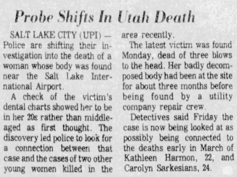 In the early stages of the investigation law enforcement thought that Smith’s murder could be linked to two other homicides in the SLC area: Kathy Harmon and Carolyn Sarkessian, who were both found dead on March 6, 1976. Harmon was a newlywed, and was last seen at the Better Days Bar four days before she disappeared. A University of Utah student out walking his dog found Kathy’s half nude remains between Parley’s Canyon and Emigration Canyon north of the Interstate-80. She had been raped, beaten, and strangled. As of December 2024 Harmons murder remains unsolved.