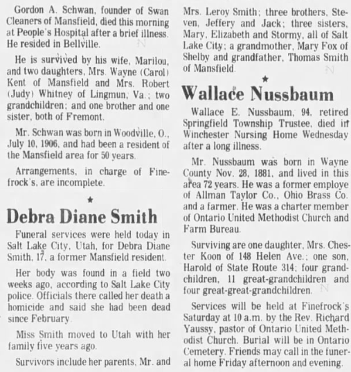 Debra Diann Smith was born on December 26, 1958 to Thomas Leroy and Thelma Lorene (nee Hoover) Smith in Mansfield, OH. Mr. Smith was born on December 14, 1938 in Lucasville, OH, and I wasn’t able to find when Thelma was born but the couple were wed in October 1957. They had seven children together but eventually divorced, and in 1971 Debra relocated with her family to Salt Lake City. According to the Utah Department of Public Safety website, Debbie Smith had brown eyes, brunette hair, was 6’7″ tall and weighed 180 lbs… but considering the picture that the website used is wrong, I’m only going to assume those stats are incorrect as well.