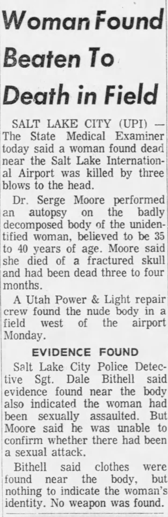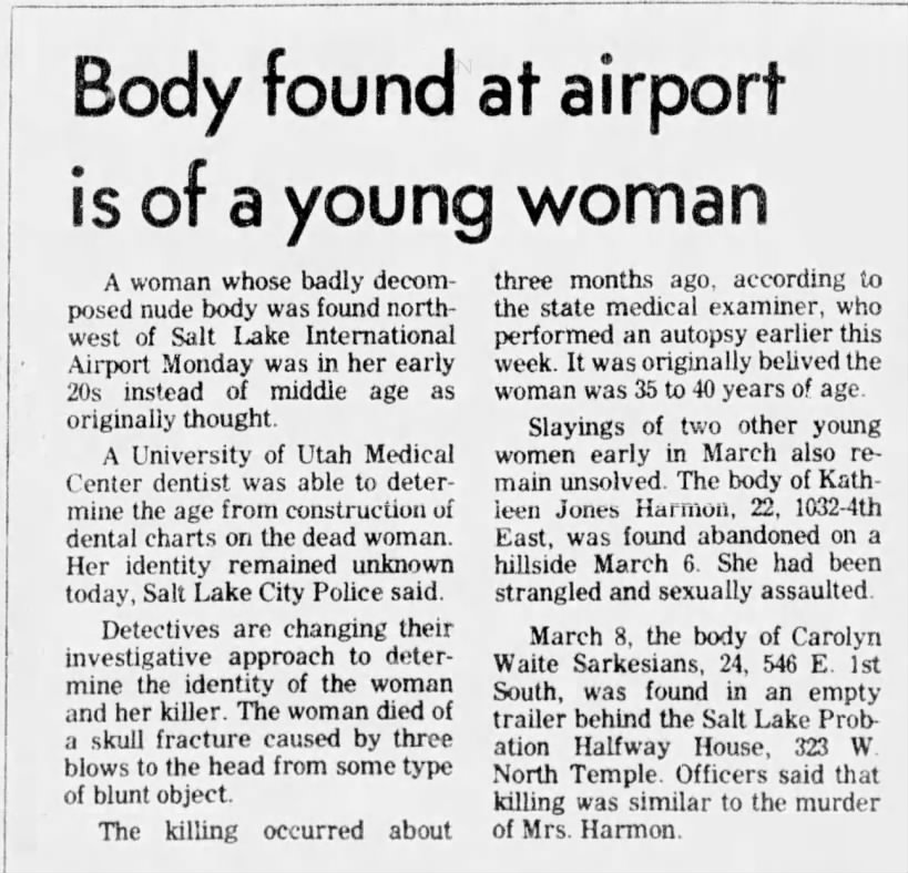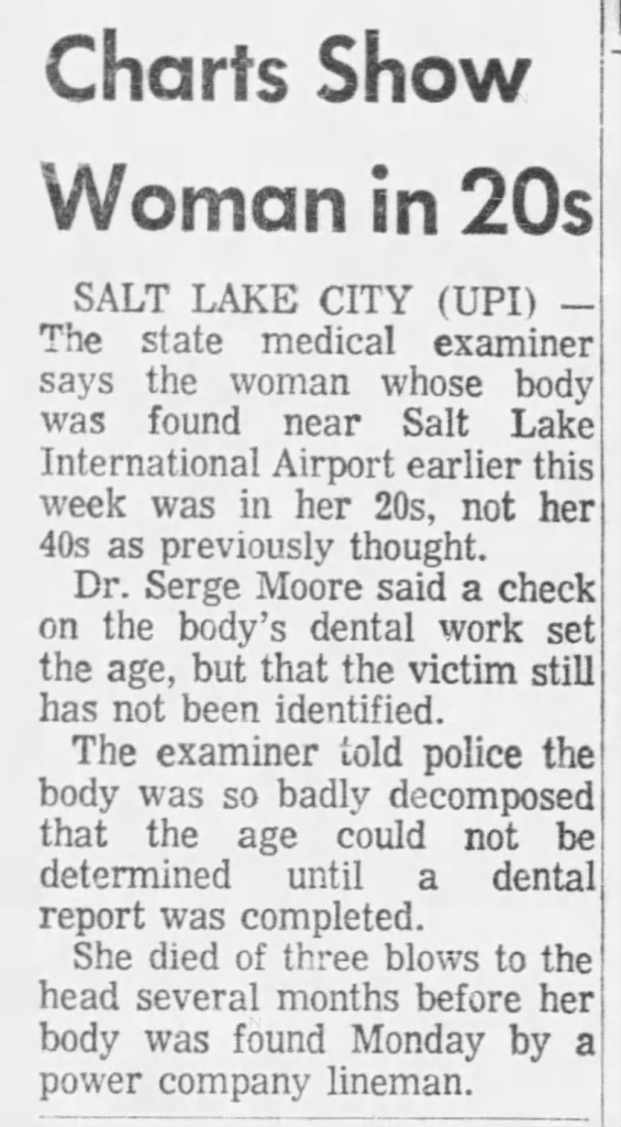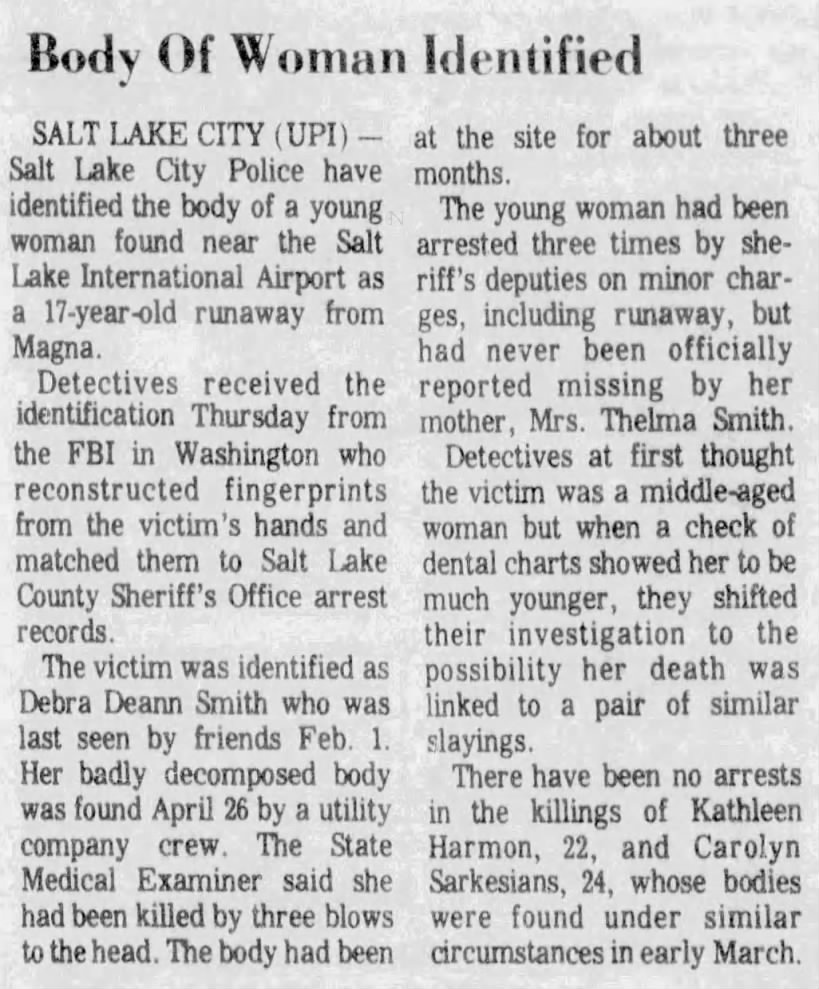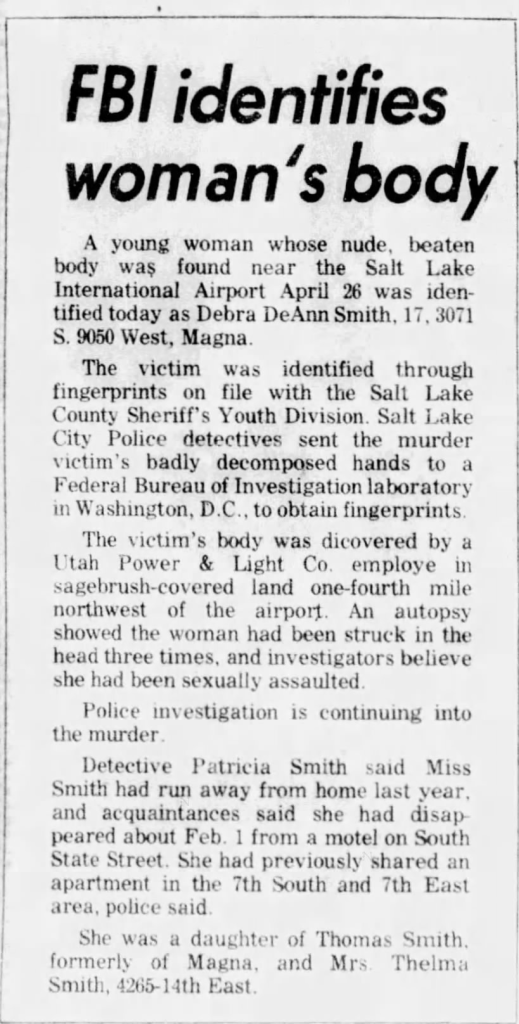 According to reports Smith was a frequent runaway before she was killed, and left home for the final time in early February 1976. According to an article published in The Bellingham Herald on December 5, 1998, Thelma Smith said that she never reported her daughter as missing because she figured she would just change her mind about leaving and would eventually just come home on her own. On Monday, April 26, 1976 her badly decomposed and nude remains were found by a Utah Power and Light worker checking on poles in an open pasture in some ‘sagebrush covered land’ located one quarter mile NW of the Salt Lake International Airport. It’s often incorrectly reported that Smith was discovered on April 1, however according to newspaper reports it was April 26, 1976.
