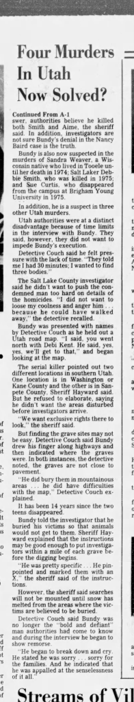 I strongly suspect that Bundy was mistaken that the unknown young woman he abducted and killed from Idaho was from Boise, and wonder if maybe she was just passing through and was ready to move on when she ran into him. When Ted said he burned her identification, did he insinuate that he looked at it and at the very least remembered where she was from? I strongly suspect the young woman he abducted wasn’t from Idaho at all, and was from a surrounding state and just happened to be passing through when he killed her.