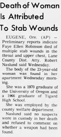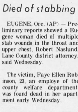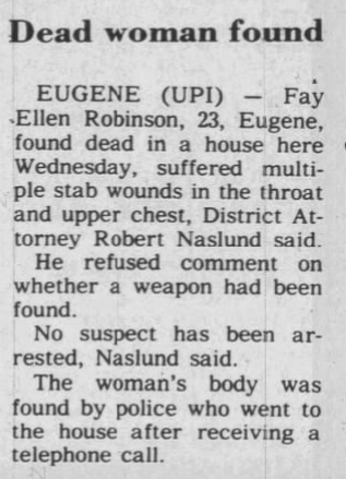 At around 7 AM on Wednesday, March 22, 1972 Fay Ellen Robinson was found dead in her bed in her downtown apartment. According to former Lane County Public Attorney Robert Naslund, a friend and coworker named Samuel Owens made the gruesome discovery and had stopped by to give her a ride to work. She was fully clothed, dressed in pants and a sweater, and suffered from stab wounds in her neck and upper chest. According to police, Robinson’s apartment was located alongside an east-west alley located off Oak Street, and her neighbors said they heard her return home the night before at around 10 PM but didn’t hear anything unusual after that.
